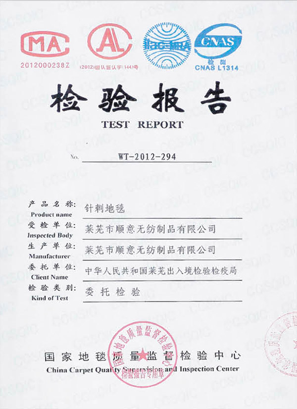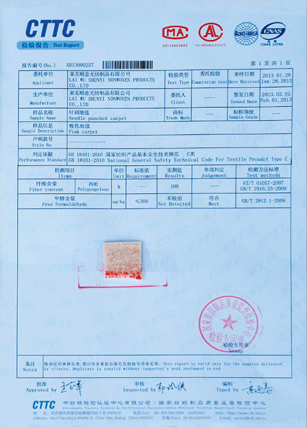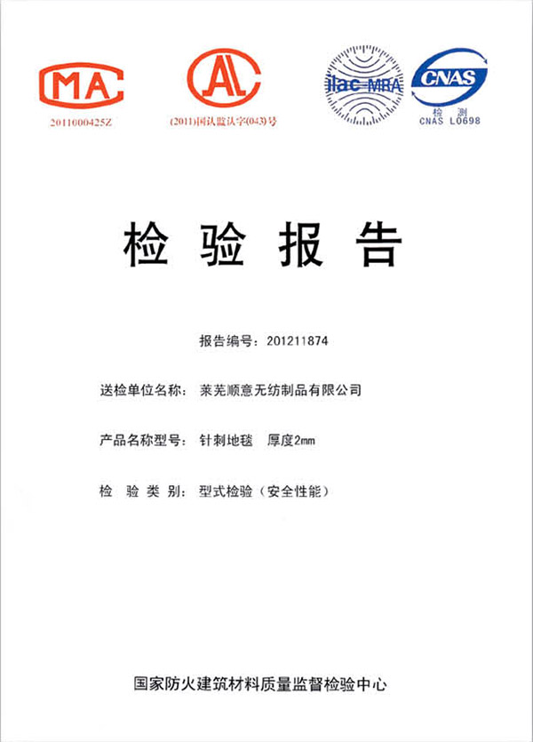 • 本公司生產(chǎn)的無紡阻燃地毯檢測合格